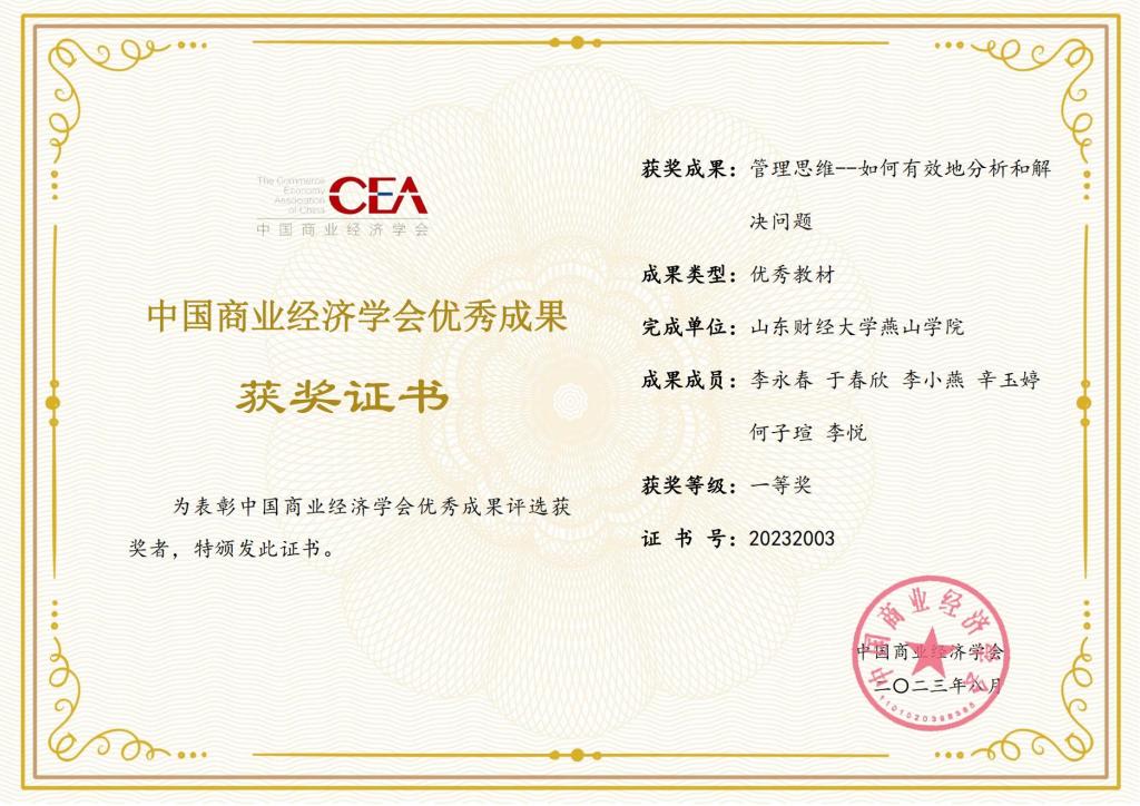 在剛剛結(jié)束的中國商業(yè)經(jīng)濟學(xué)會2023年度優(yōu)秀成果評獎活動中,由6776永利集團院長李永春教授主編的教材《管理思維---如何有效地分析和解決問題》榮獲優(yōu)秀教材一等獎。同時,在8月份進行的山東省第十五屆大學(xué)生科技節(jié)活動中,6776永利集團李永春、劉金煒指導(dǎo)的學(xué)生組榮獲山東省大學(xué)生智慧企業(yè)管理創(chuàng)新設(shè)計大賽數(shù)字商業(yè)企業(yè)模擬經(jīng)營對抗賽道一等獎。另外,在前不久公布的山東省教育科學(xué)研究院組織的2023年度山東省教育教學(xué)研究課題...